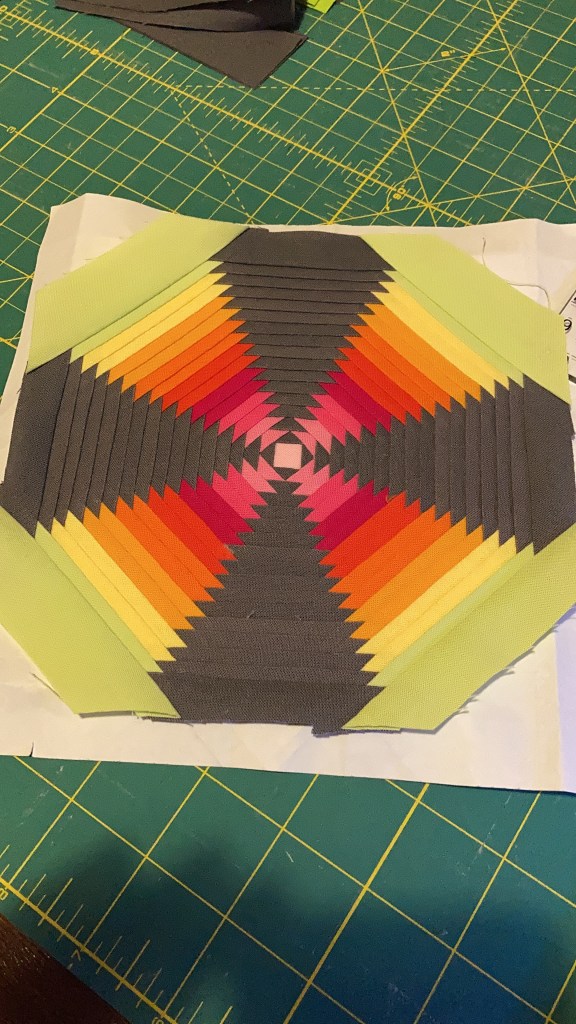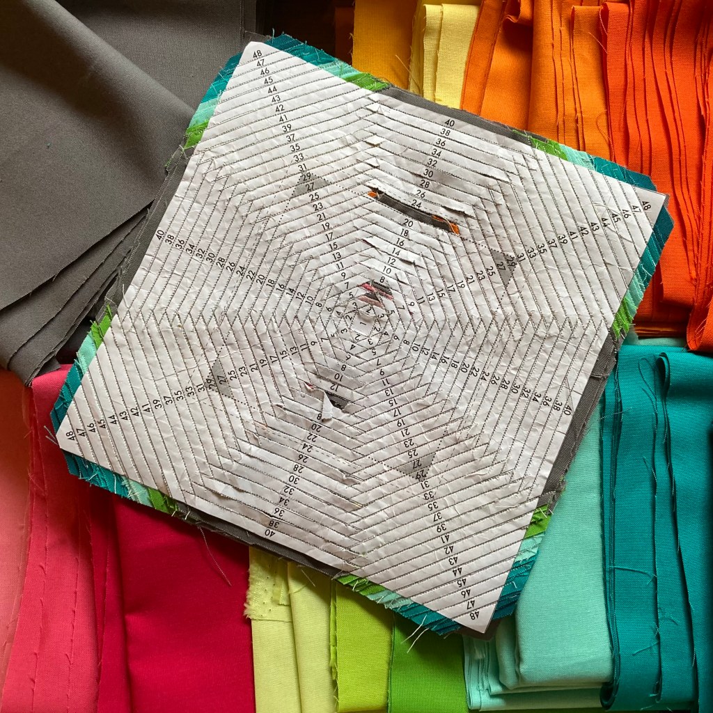The pattern I used is the pineapple block from the mini-series, by Giuseppe Ribaudo, known as GiucyGiuce on Instagram. and Alison Glass. Each line is less than a quarter inch wide and you can go as big or small as you want with this pattern. It’s a foundation papier pieced pattern, this means you sew on the back of the paper and use it as guide line. This helps you create nice straight lines, and to make sure each line has the same with as the previous one.