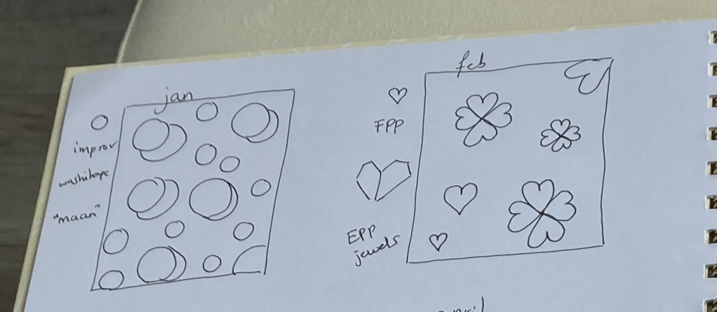 So each month were are challenged to work with a different shape. As the current president of the guild I know what shapes are coming, so this gave me some more time to think ahead about my plans for this years project. The last two years I made a quilt in the size of a wallhanging, but this year I wanted to something a bit different. Because we get a new challenge each month, the idea of a calender came to mind and I started working with that idea. To make a mini quilt each month with the shape, roughly the size of a sheet of printing paper.