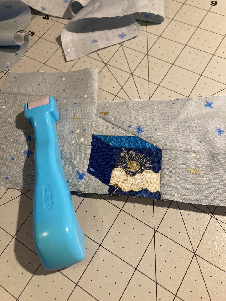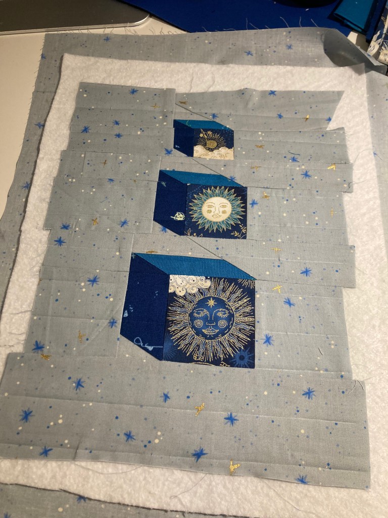 For the first month the shape was a circle, inspired by the long nights and short days I wanted to do something that represented that feeling. I found the perfect background fabric in a dark blue that reminded me of a starry night sky.