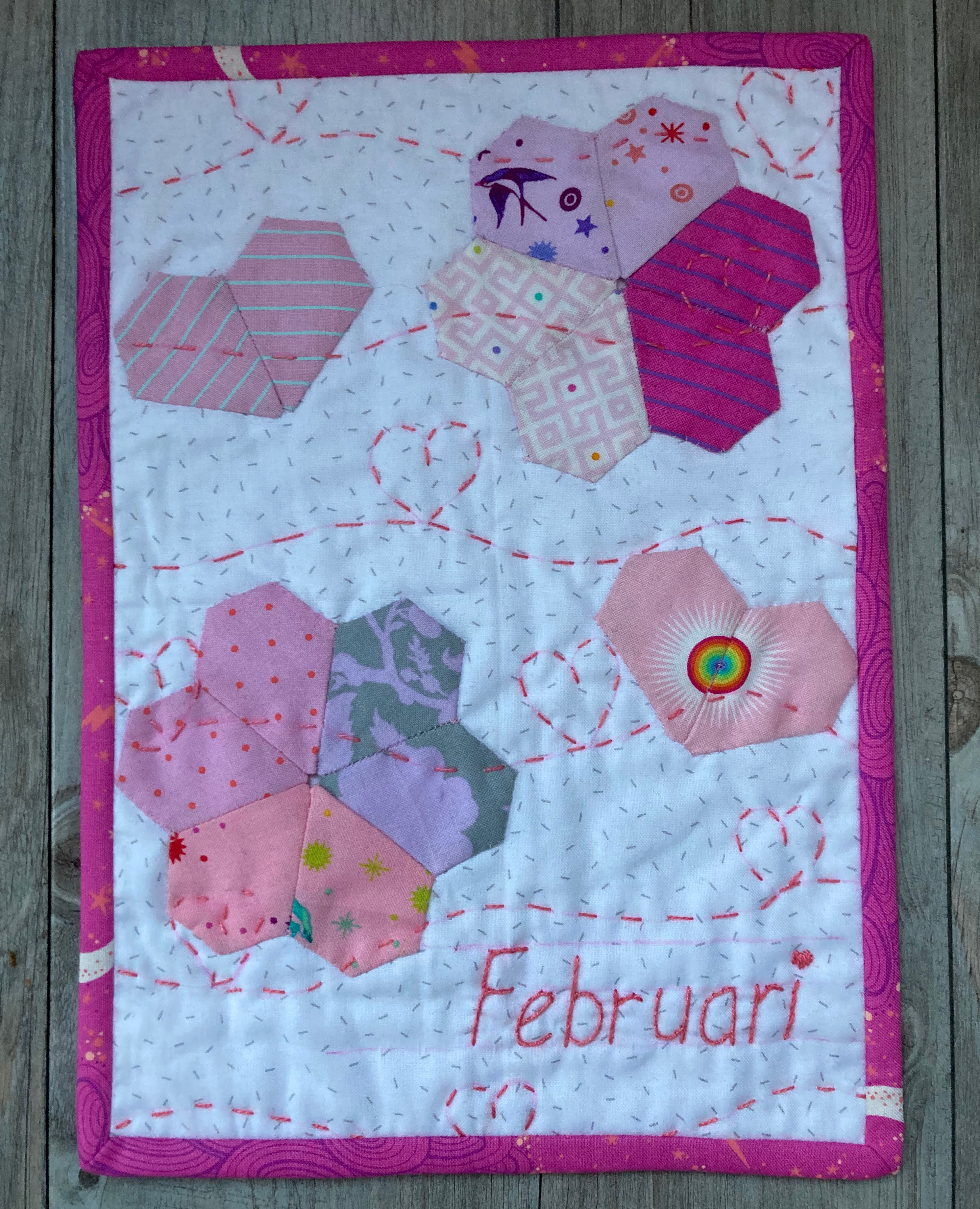To even make it look less like a hart, I combined 3 harts to create a flowershape. I hand appliqued the shapes down and added some bigstitching with a thicker pink thread to quilt this page. To make the hartshape stand out more I added some hartshapes into the quilting. I also used the same thread to embroider the month on this calender page. Using a double thread to give it even more body.