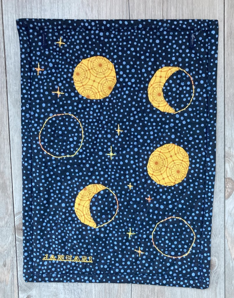 I added some circles and semi-circles to represent the moon in different stages. To still give the idea of a circle I handstitched the rest of the circle as an outline. This year I also want to play around with the different options my Bernina sewing machine has, so for January I added the letters with the embroidery option my B350 has.