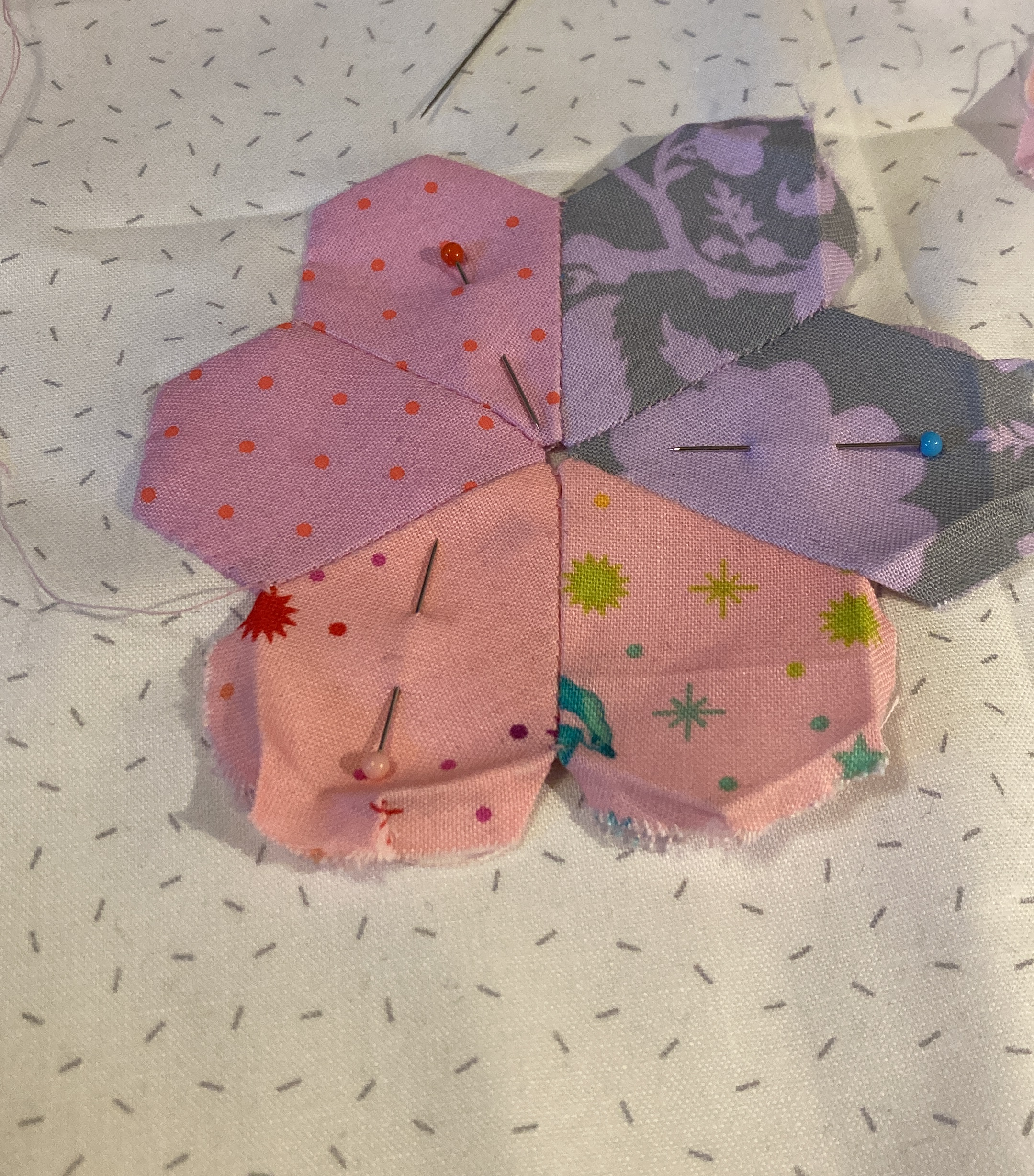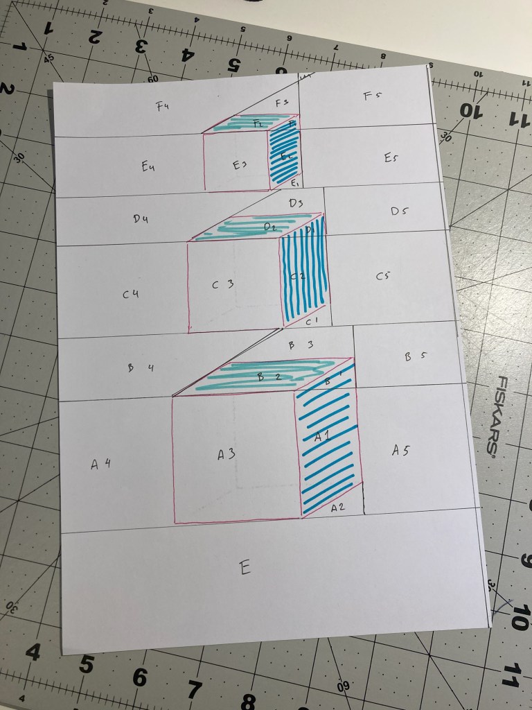 I started by drawing 3 different squares in pink and added lines to create the cube and 3D effect. The next step was to play around with turning it into an FPP (foundation paper piecing) pattern. This took some figuring out, how to keep it as simple as possible and also trying to prevent bulky seams. It came together pretty well I think. Now onto sewing and piecing the different parts of the pattern.