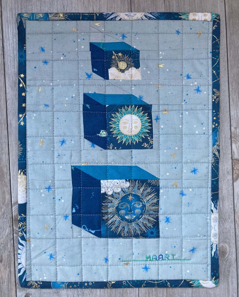 For the quilting of this page, for me there was only one real option. Ofcourse that had to be a square pattern. Using my Hera marker I marked out the lines and quilted this page in using a grey 50wt thread. For the machine embroidery of the month I used a 12wt variegated thread by Sulky. I Added a binding using the same fabric as I did for the front of the cubes and now the first three pages of my calender are done.