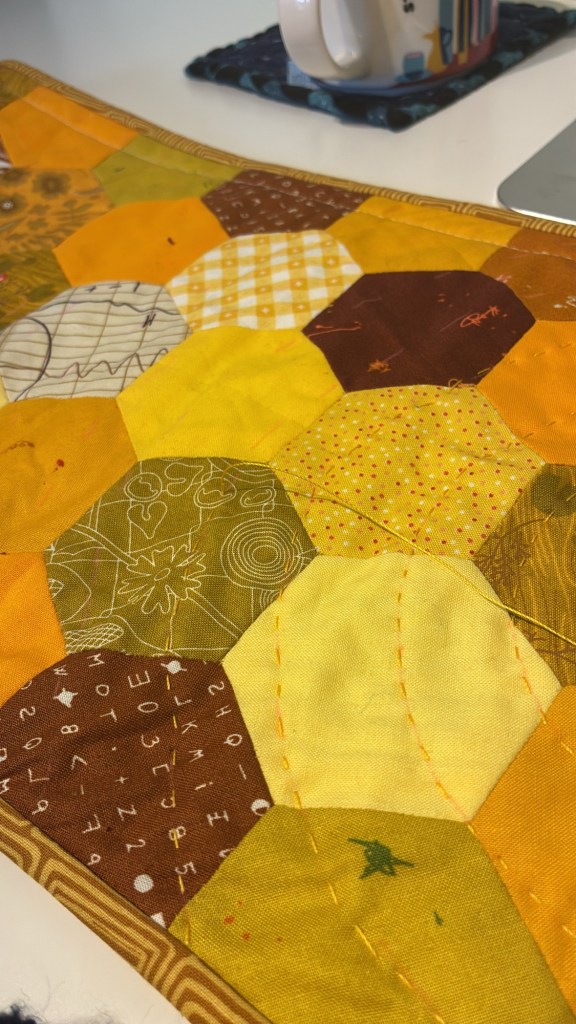 I had a lot of English paper piecing on my wishlist for the end of the year—far too much to realistically finish. But during the last week of the year, I was really in the mood for slow stitching. I finished the yellow-ochre hexagon table runner (goal 8), added one row of stars to my Super Nova quilt (goal 3), and added lots of little hexies to the Tilda EPP top.