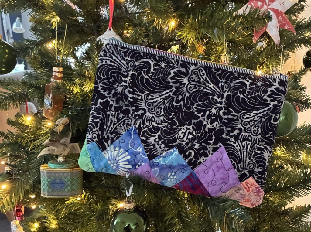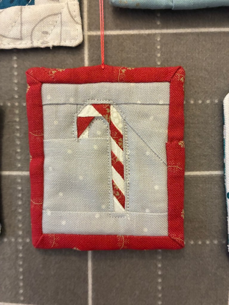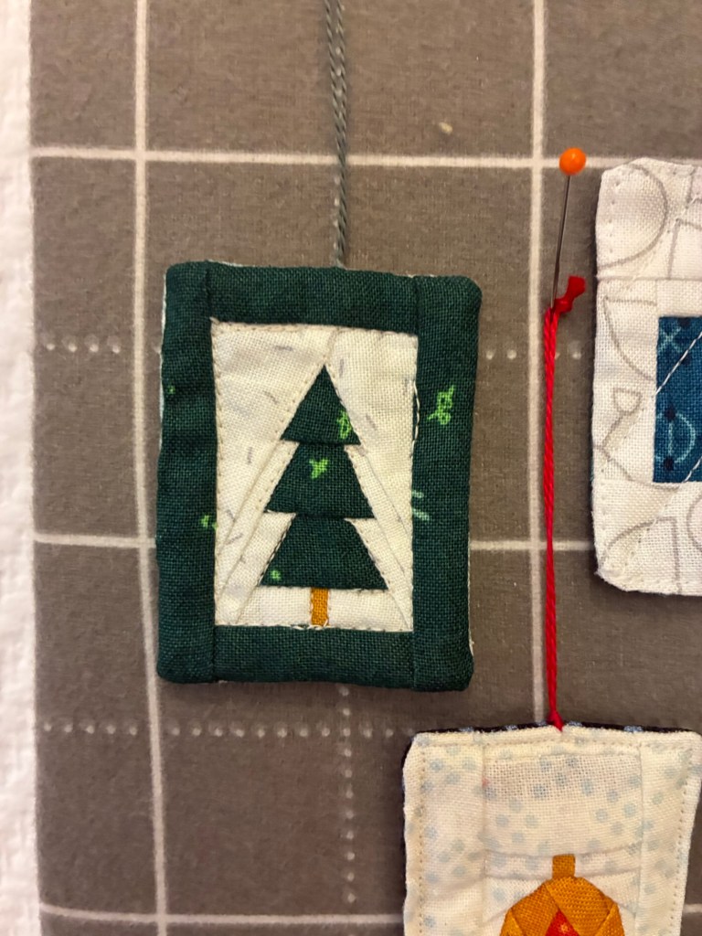 My final finish of the year was a set of Christmas ornaments using patterns by Happy Sew Lucky. Take a good look at the background of the photo—the grey squares are 1″ × 1″ for reference.